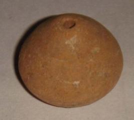 | Description / विवरण | Perforated terracotta betel nut shaped bead with a circular slight depression on the base. |