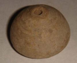 | Description / विवरण | Perforated terracotta betel nut shaped bead with a flat base. |