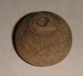 | Description / विवरण | Terracotta perforated, betel nut shaped bead with a slight depression on the base. Concentric circles are seen on the body. |