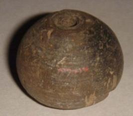 | Description / विवरण | Perforated terracotta betel nut shaped bead with a circular depression on the base. |