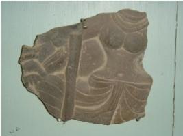 | Description / विवरण | Fragment of an stone image of Female figure depicting the body from neck to thigh. She is adorned with necklaces having incised designs and wearing a drapery, folds of which are depicted with the help of incised lines. Her left hand is missing and right hand is unclear. Towards the extreme right a hand can be seen, wearing bangles and holding the drapery of the female figure. |