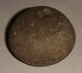| Description / विवरण | Perforated terracotta, betel nut shaped bead with a slight depression on the base. |