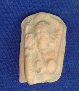 | Description / विवरण | Lime female figurine till bust. The head has decorated hair style, rubbed off facial features, breast is prominent. The right hand is folded upwards and the left hand is raised above the head. The figurine is bedecked with earrings and bangles. |