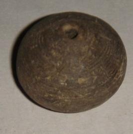 | Description / विवरण | Perforated terracotta betel nut shaped bead with a slight depression on the base while on the body the concentric circular are prominent. |