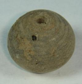 | Description / विवरण | Terracotta bead, betel nut in shape with a small depression at the base. A perforated hole at the centre may be used to put a string, close striation marks are prominent on the body. |