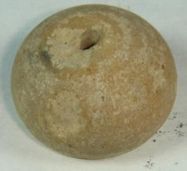 | Description / विवरण | Terracotta bead, betel nut in shape with a small depression at the centre. There is a perforated hole at the centre probably used to put it in a string, close striation marks are seen on the body. |
