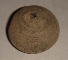 | Description / विवरण | Perforated terracotta bead, betel nut body with deep depression at base. |