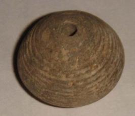 | Description / विवरण | Perforated terracotta bead, betel nut body with close striation marks and slight depression at base. |