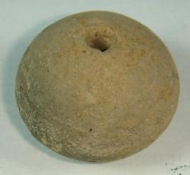 | Description / विवरण | Terracotta bead, betel nut in shape with a small depression at the centre. There is a perforated hole at the centre to put it in a string. Close striation marks are prominent on the body. |