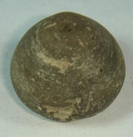 | Description / विवरण | Terracotta bead, betel nut in shape with a flat base. A transverse perforation at the centre to put it in a string, close striation marks are prominent on the body. |