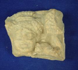 | Description / विवरण | Lime female figurine in high relief in standing pose, only the head portion is shown with fixed head dress, its eyes, nose and mouth are visible. |