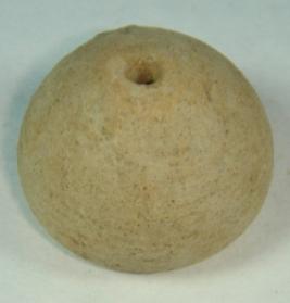 | Description / विवरण | Terracotta bead, with a circular base and a small depression at the centre. There is a perforated hole at the centre to put it in a string, close striation marks are prominent on the body. |