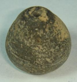 | Description / विवरण | Terracotta bead with flat circular base and a small depression at the centre. There is a perforated hole at the centre to put it in a string, close striation marks are prominent on the body. |