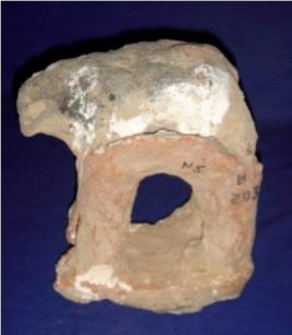 | Description / विवरण | Terracotta animal figurine - elephant standing on a rectangular pedestal, legs are intact and red colored, body is broken. It is ill fired because core part is black. |