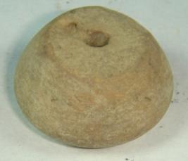 | Description / विवरण | Terracotta bead with flat circular base and a small depression at the centre. There is a perforated hole in the centre to put it in a string, close striation marks are prominent on the body. |