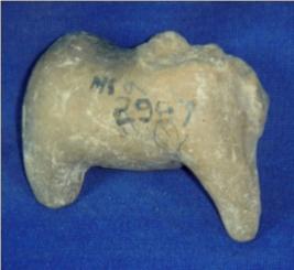 | Description / विवरण | Fine terracotta animal figurine, ill fired, probably a humped bull. The head, the hump and both hind limbs and fore limbs of right side are missing. Only left hind limb and forelimb are intact. Incised holes are seen in place of tail and genital organ. |