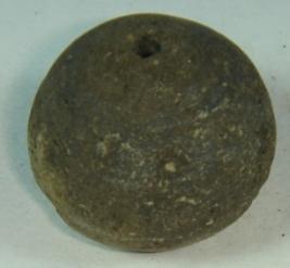 | Description / विवरण | Terracotta bead, with flat circular base and a small depression on the centre, betel nut in shape, a perforated hole at the centre to put it in a string. Close striation marks are prominent on the body. |