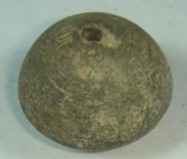 | Description / विवरण | Terracotta bead, betel nut shape, with a flat circular base. There is a perforated hole at the centre to put it in a string. |