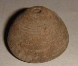 | Description / विवरण | Perforated terracotta bead, betel nut body with close striation marks, base with slight depression. |
