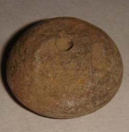 | Description / विवरण | Perforated terracotta bead, betel nut body but chipped off from top, base with slight depression. |