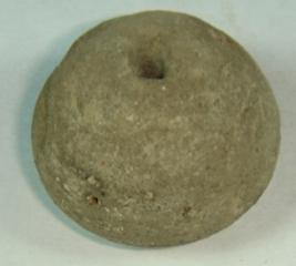 | Description / विवरण | Terracotta bead, betel nut shape, with flat circular base and a small depression at the centre. There is a perforated hole at the centre to put it in a string. |