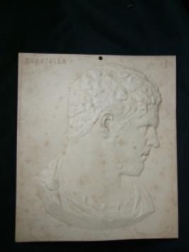 | Description / विवरण | A portrait of a male model in profile named Caracalla . It is a relief work on rectangular sized cardboard thin . The face of the model is slightly bent. He is having curved hair and wearing a cloth with batch. |