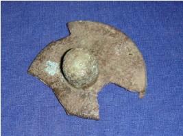| Description / विवरण | Metal circular lid with a circular knob, without any decoration. It is broken and patina is formed. |
