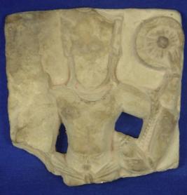 | Description / विवरण | Bust size image of four handed Vishnu in standing position. Attributes from right below 1.Chopped off 2. Chopped off 3. A chakra 4. Shankha. The face is chopped off and body below hip is missing. He is adorned with necklace, wristbands and part of banmala is visible across the left arms. He is wearing a lower garment, folds of which are clearly visible. |