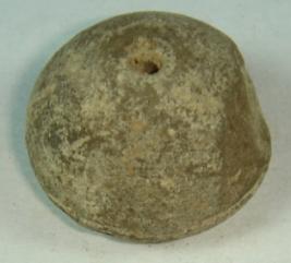 | Description / विवरण | Terracotta bead, betel nut shape, with flat circular base and a small depression. The carination marks are seen on the body. There is a perforated hole at the centre to put it in a string. |