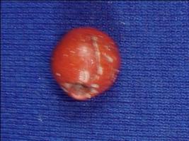 | Description / विवरण | Carnelian stone bead, circular in shape, scarlet in color, with a perforated hole in the center. |
