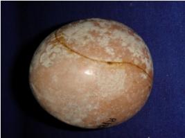 | Description / विवरण | Oval shaped vessel of clay, having a small hole at the top. The surface is plain, without any decoration. It was broken into two pieces but restored later. |