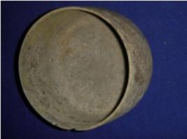 | Description / विवरण | Bowl made with painted grey ware technique, round in shape, with flat base, without any design in both sides. It has featureless rim which is slightly cracked and broken. |