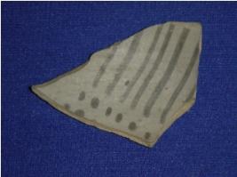 | Description / विवरण | Painted grey ware, plain on outer side but inner side has painted spots and horizontal line designs. |