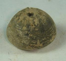 | Description / विवरण | Perforated terracotta bead, betel nut body, base with slight depression and close striation marks. |