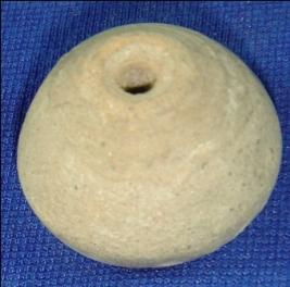 | Description / विवरण | Terracotta bead, betel nut shape with broad circular base with a depression. A transverse perforation at the centre to put it in a string. Close striation marks are present on the upper part of the body. |