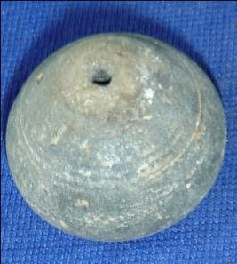 | Description / विवरण | Terracotta bead, with flat circular base with a small depression at the centre. A transverse perforation is at the centre to put it in a string. Close striation marks are prominent on the body. |