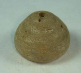 | Description / विवरण | Perforated terracotta bead, betel nut in shape, base is flat some incised circles on the flat base, surface is smooth and day incrustation all over. |