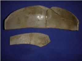 | Description / विवरण | Painted grey ware potsherd having an inverted rim, circular body. The inner side has wavy patterns painted in black colour, on both ends and near the centre and the outer side has serpentine designs near the centre. It is broken into five pieces, but restored. |