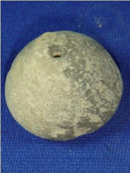 | Description / विवरण | Terracotta bead, betel nut shape with broad circular base with a depression. A transverse perforation is at the centre to put it in a string. The whole body is rubbed off slightly. |