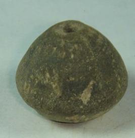 | Description / विवरण | Perforated terracotta bead, betel nut in shape depression at base, clay incrustation all over, surface is rough. |