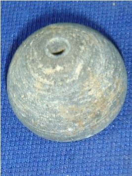 | Description / विवरण | Terracotta bead, betel nut shape with flat circular base. A transverse perforation is at the centre to put it in a string. Close striation marks are prominent on the body. |