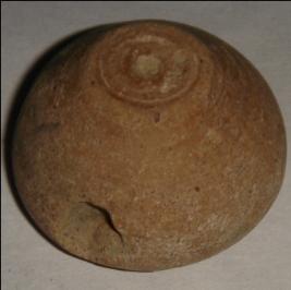 | Description / विवरण | Terracotta bead, betel nut shape with broad flat circular base on which a small depression is seen. A transverse perforation is at the centre to put it in a string. A small breakage is on the body. |