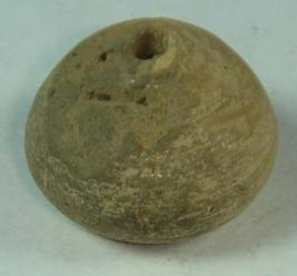 | Description / विवरण | Perforated terracotta bead, betel nut in shape, depression at the base, surface is smooth, clay incrustation all over. |