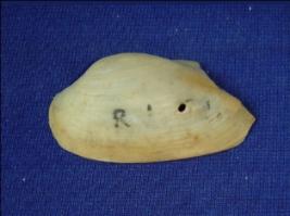 | Description / विवरण | Piece of a small scallop. One side is broken and there is a small hole near it. |