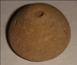 | Description / विवरण | Terracotta bead, betel nut shape with broad circular base. A transverse perforation is at the centre to put it in a string. An incised line is seen on the base. |