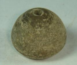 | Description / विवरण | Perforated terracotta bead, betel nut in shape slight depression at base, striation over body and base. |