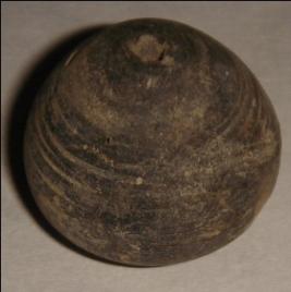 | Description / विवरण | Terracotta bead, betel nut in shape with broad circular base. A transverse perforation is at the centre to put it in a string. It s surface is plain. |