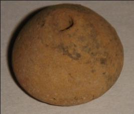 | Description / विवरण | Terracotta bead, betel nut shape with broad circular base. A transverse perforation is at the centre to put it in a string. Close striation marks are prominent on the body. |