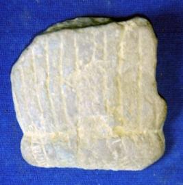 | Description / विवरण | Fragment of stone, with incised parallel lines at one side which are slightly flaked off, and reverse side is chopped off. It is probably fragment of a stone image. |