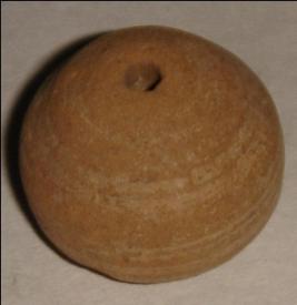| Description / विवरण | Terracotta bead, betel nut shape with flat circular base. A transverse perforation is at the centre to put it in a string. Close striation marks are prominent on its body. |